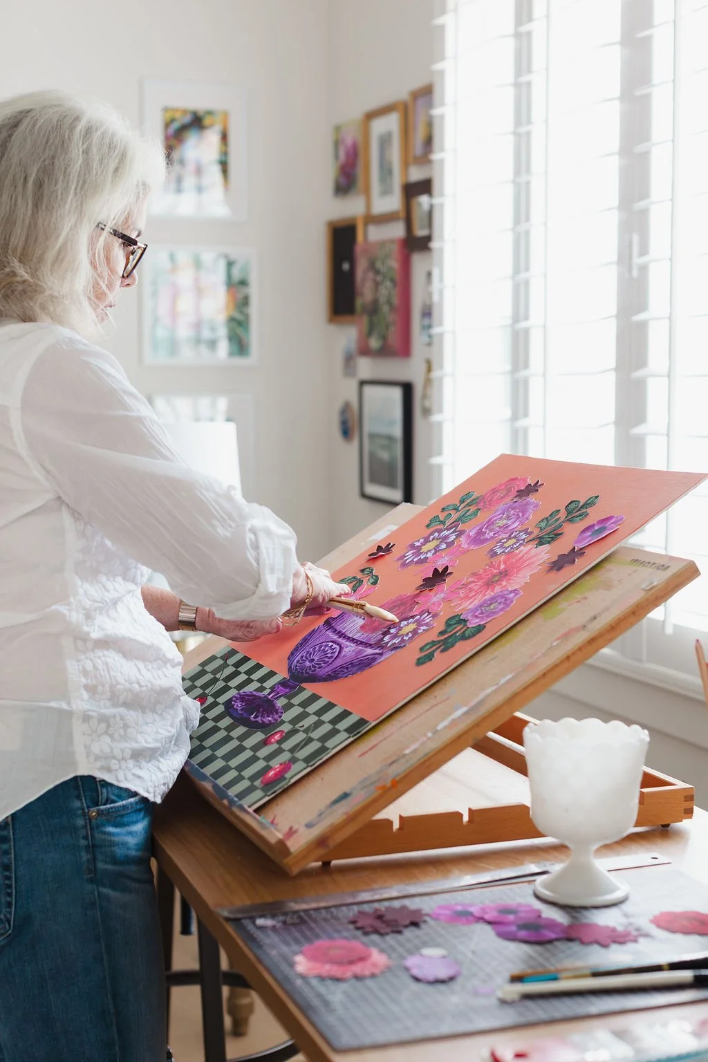 The last year has been a whirlwind of doing art shows, entering competitions and cutting out many thousands of paper flowers. I wanted an updated online presence that captures where I am today with my floral art and all of the opportunities it presents. I like to think of my brand as a lovely “luxury picnic” with all the flowers I love to grow combined with the happy checks, dots, plaids and stripes that help create the whimsical style I love. Now I’m not only making art, but have designed fun new products that feature my collages.