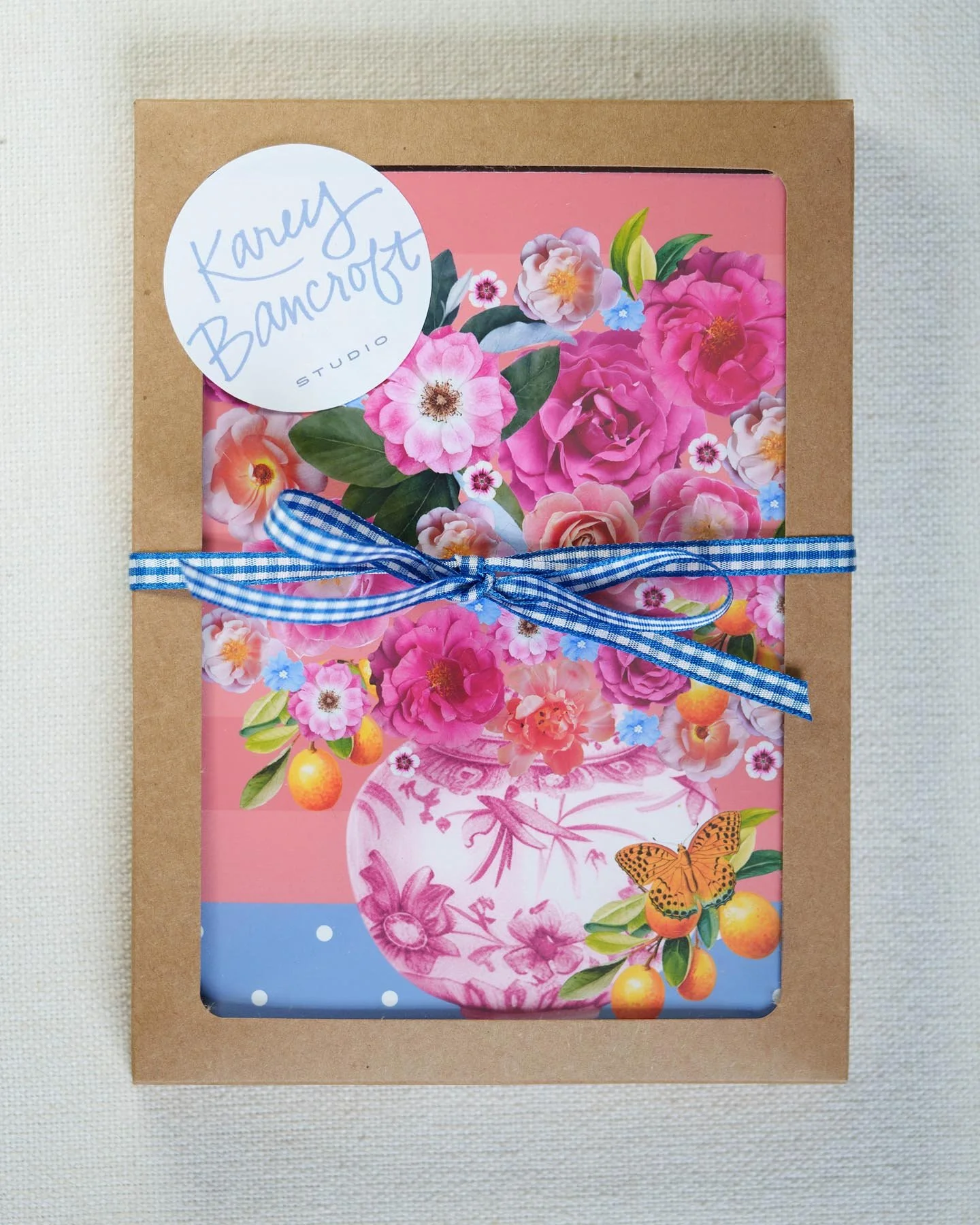 Eight gorgeous cards (2 each of 4 designs) are printed on fine art smooth matte card stock and packaged in a sweet box with gingham ribbon.