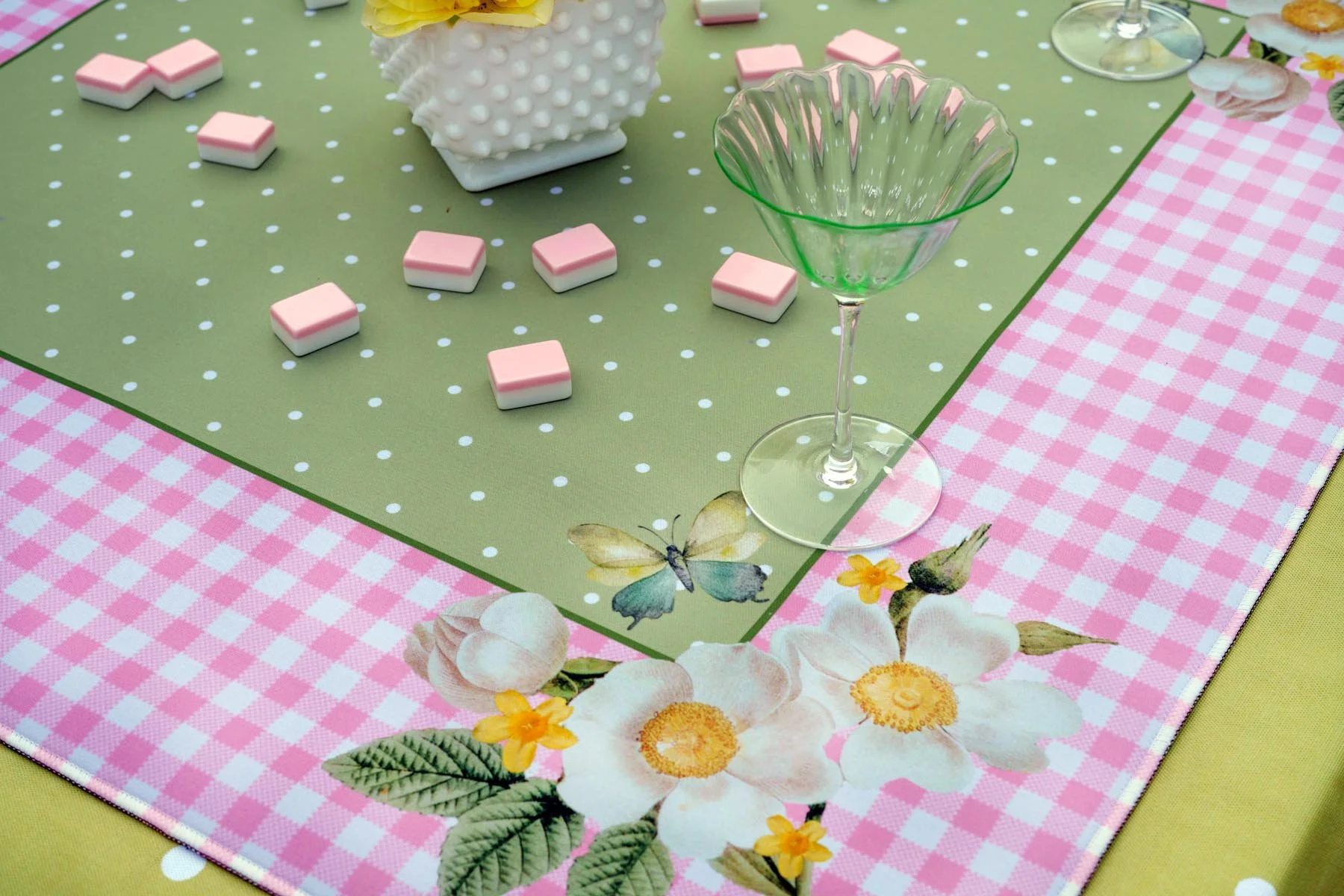 When you are hosting mahjong, your table deserves more than just a mat. Now you can have beautiful coordinating table cloths, napkins, party plates and tile bags. And to add a little versatility, these pieces look great on their own beyond mahjong for any lovely small gathering.